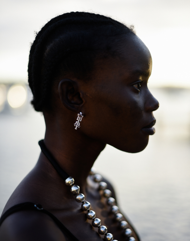 Inspired by the spear carried by the warrior Queen Majaji, the Spearhead Earrings combine hand-carved arrow-shaped hematite cabochons and an intricate white agate inlay. The downward facing arrows suspended from a simple silver arrow stud, are a Native American symbol of peace - Sterling Silver with Hematite and White Agate